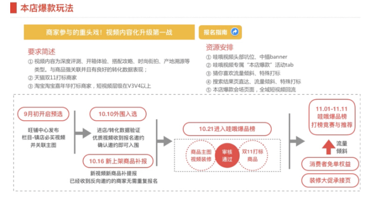 添加免单权益、视频打榜结果优胜或者装修到大促店铺承 接页的的视频将获得本店爆款活动页面额外流量倾斜;